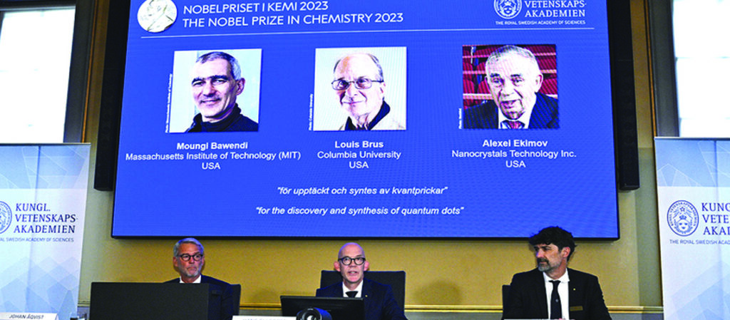 وكافأت اللجنة الباحثين الثلاثة الذين سُربت أسماؤهم عن طريق الخطأ إلى الصحف السويدية قبل ساعات من الإعلان الرسمي، على «اكتشاف وتطوير النقاط الكمومية، وهي جسيمات نانوية صغيرة جداً، لدرجة أن حجمها يحدد خصائصها»، بحسب الهيئة المسؤولة عن الجائزة. وتُستخدم النقاط الكمومية في نشر الضوء عبر أجهزة التلفزيون ومصابيح «ليد» LED، ويمكنها توجيه الجراحين عند إزالة أنسجة الأورام.